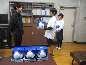 贈呈式では、代表児童がFC岐阜の方からサッカーボールを受け取りました。