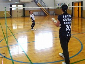 お話の後は、プロのバドミントン選手によるラリーを見せていただいたり、シャトルを投げてもらってバドミントン体験をしたりしました。