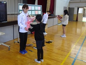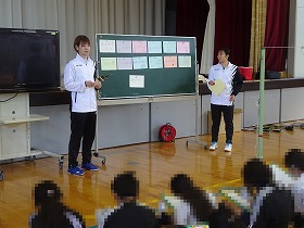 11月20日(木)、キャリア教育の一環として、岐阜県を本拠地とする女子プロバドミントンチーム「岐阜Bluvic」の廣田 彩花選手、宮﨑 淳美選手に来ていただきました。