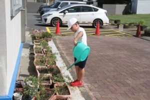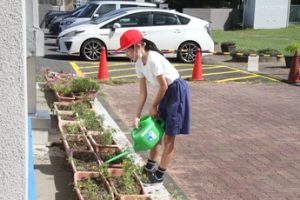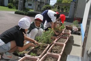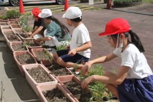 枯れた植物を抜き取り、マリーゴールドの苗を丁寧に植え付けていきました。