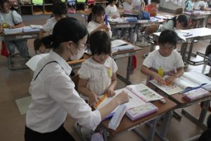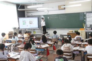この日は、教育実習生の授業です。子どもたちは、先生の話をよく聞きながら、学習に取り組みました。
