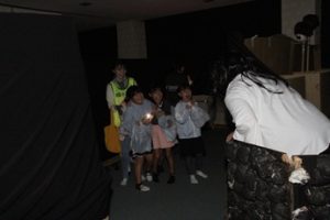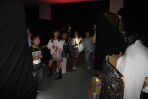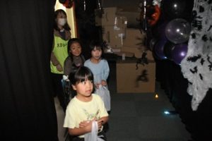 公民館の中には、様々な仕掛けがしてあります。突然、出てくるお化けの姿に子どもたちはビックリ!「キャー」と驚きの声を出しながら、仲間と一緒に前へ進んでいきました。