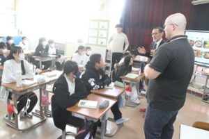 どこの国の出身ですか。出身国で有名な食べ物は何か。・・・など、尋ねたい内容を思い浮かべながら、簡単な英語を使って会話する練習をしました。