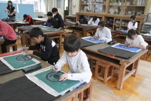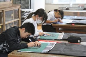 11月5日(水) 5年図工では、運動会演技「木田小ソーラン」で着用するはっぴ作りをしています。最終段階の作業として、はっぴの背中に入れる文字をカッターナイフで切り出していきました。