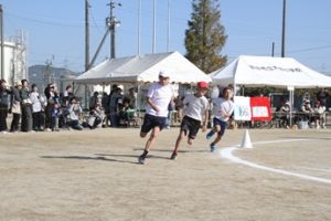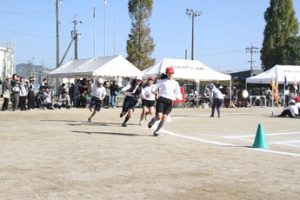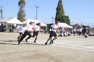 5年生による「情熱の100m走」です。高学年は、100mの距離を全力で走り抜けます。学級目標の「パッション」。熱い思いで走り切りました。