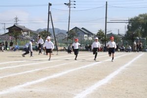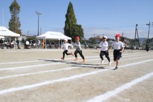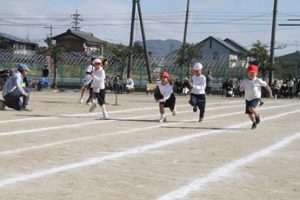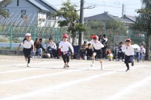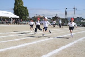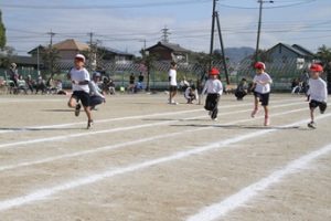 1年生による「30メートルダッシュ!」です。小学校はじめての運動会。直線コース30メートルを、全力で走りきりました。