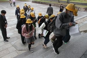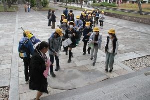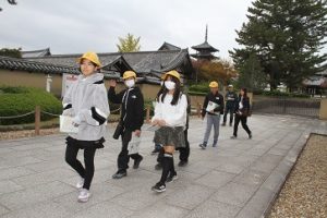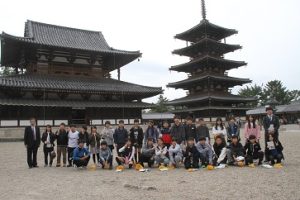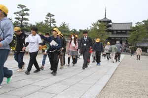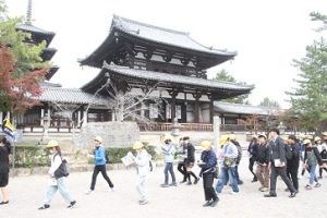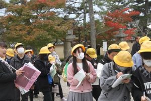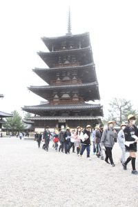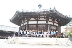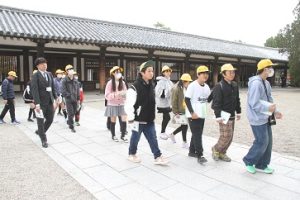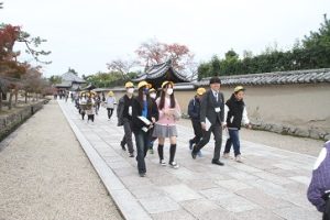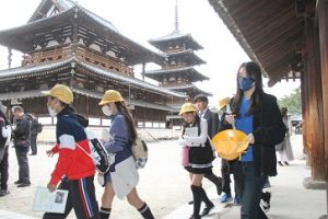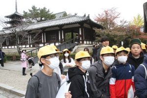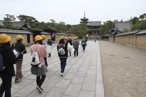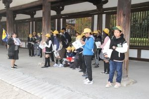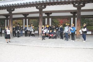 11月13日(木) 修学旅行の最初の見学地は、法隆寺です。法隆寺といえば、七不思議。この法隆寺に伝わる七不思議を一つ一つ確認しました。