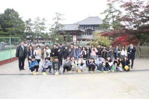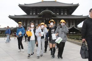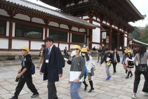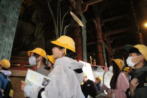 11月13日(木) 法隆寺の見学を終え、2番目の見学地は、東大寺です。東大寺には、修学旅行生だけでなく、海外からの観光客も多く、並びながら一方通行の見学となりました。