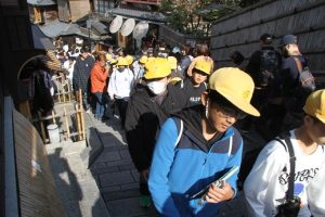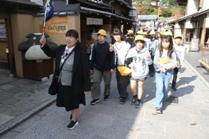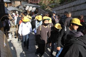 11月14日(金) 高台寺の駐車場から、清水寺まで歩いて移動しました。坂のある街並みを見物しながら移動することとなります。風情のある街並みですが、どこへ行っても人の多さには驚くばかりです。迷子にならないように、清水寺に向けて歩きました。