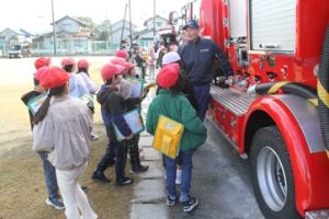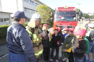 最後に、消防署の仕事について、署員の皆さんに子どもたちから質問が寄せられました。「何メートルくらいまで消火できるのか。(はしご車)」「一番多い火事の原因は何か。」「1日、どれくらいの火事が起きているのか。」「消火するまでの時間は、どのくらいかかるのか。」「消防士と消防団の違いは何か。」など、疑問に思ったことを尋ねていきました。