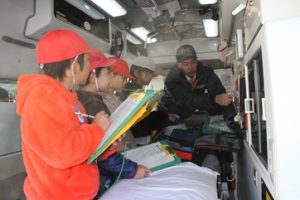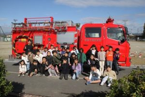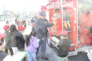 はじめに、救急車と消防車の見学をさせていただきました。班ごとに固まって、2つの車の見学をさせていただきました。救急車や消防車の中の様子を見ることは、なかなかできません。それぞれの車に搭載されている道具や機材に触れさせていただき、子どもたちは大興奮です。