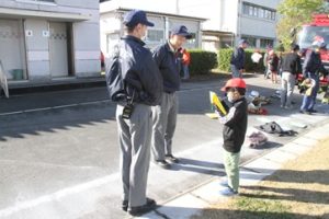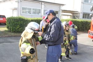 次に、実際に使用されている消防服を試着させていただきました。子どもたちは、身動きが取れないくらいの重さにビックリ。なんとその重さは、全部で20㎏にもなると言います。消防士さんは、消火のときに重い消防服を着ながら、てきぱきと動いていらっしゃることに驚きを感じました。