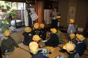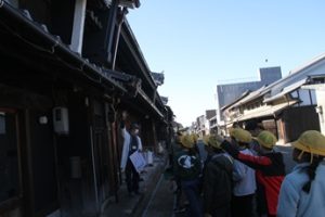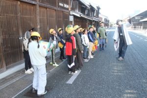 美濃市のボランティア・ガイドさんの案内で、町並みを散策しました。美濃市の町並みは、約400年前にできたといわれますが、約300年前に火災により焼失したといわれています。そこで、新しい町をつくるときには、火災を防ぐ工夫が必要となります。具体的に3つの工夫を教えていただきながら、町並みの散策をしました。