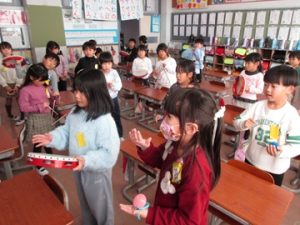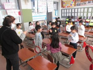12月22日(月) 1年音楽では、「おとで はなそう」の学習に取り組んでいます。言葉のリズムや音の様子をトライアングル、タンブリン、カスタネットを使って表現していきました。