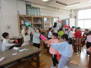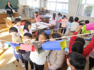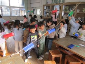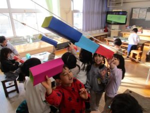 1月21日(水) 1年図工では、「スルスルビューン」の制作活動に取り組んでいます。この日は、穴の開いた箱を作り、ひもにひっかけて滑らせて遊びました。楽しみながら、制作活動を行うことができました。