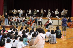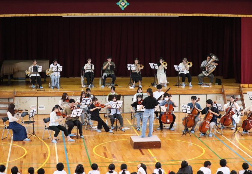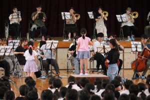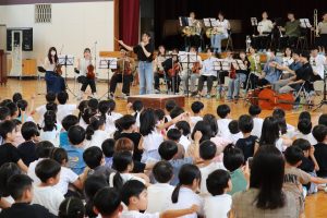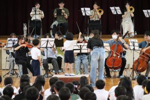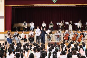 令和7年9月24日(水)の5時間目に体育館で音楽鑑賞会を行いました。岐阜大学管弦楽団(岐大オーケストラ)の皆様を本校のPTA会長がお招きし,実現された行事です。本来,9月5日(金)に行う予定でしたが,その日は警報発表による臨時休業日になったため音楽鑑賞会を中止にしました。ただその後,岐大オーケストラの皆様が何とか日程の調整を行っていただき24日に実現できました。当日は,楽器紹介を楽しく行っていただいたり,本校児童の指揮による演奏も行っていただいたりしました。1時間の短い間でしたが,素敵な時間を過ごさせていただきました。岐大オーケストラの皆様,大変お世話になりました。ありがとうございました。