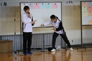 13:00からは岐阜Bluvicのバドミントン選手である廣田選手,宮崎選手をお迎えして,夢を実現させるために頑張っていることなどのお話をしていただきました。特に廣田選手は東京オリンピックで「フクヒロペア」として出場した有名な選手ですので,オリンピックを迎えるまでの思いから今日までの色々な思いを話され,今も夢に向かって努力されていると全校児童に伝えていました。その後,児童代表30名と共にバドミントンを行っていただいたり,児童からの様々な質問に答えていただいたりしました。2人の選手がお帰りになる時,校長が明郷小学校の児童の感想を聞いたところ,2人の選手からは「とても積極的に発言してくれて嬉しかったです。また,発言の内容も小学生らしく可愛らしいものや,こちらがドキッとするほど大人に近い感覚の発言がありびっくりしました。」と話していただきました。いつもの明郷小らしい「たくましさ」が表れていたと思います。廣田選手,宮崎選手お忙しい中,ご来校ありがとうございました。