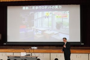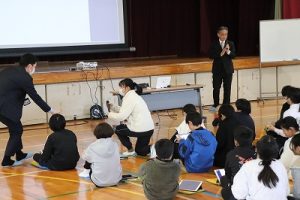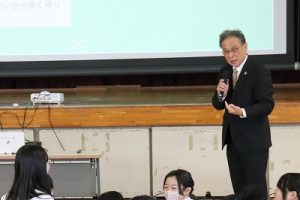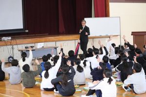 1月19日(月)の2時間目に,6年生が体育館で「教育長スクールミーティング」を行いました。岐阜市の水川教育長様(以下教育長さんと書かせていただきます)が本校に来校され,「今日が楽しく,明日も来たくなる『未来の学校』とは?」をテーマに6年生との意見交流を行っていただきました。教育長さんはいつも通りの気さくな雰囲気で,「一番好きな教科は何?」,「学校で一番うれしいことは?」,「明日もまた来たい学校ってどんな学校かな?」など本校のアンケート調査結果を基にしながら会を進行されました。後半になると6年生から「大学みたいに授業を選択できる学校になると楽しい」とか「1年生と一緒にいられる時間を増やしてほしい」などの思いが語られました。教育長さんは意見を間近で受け止めながら,最後に「教育委員会で検討したい意見が多く聞けて良かった」と感想を話されていました。