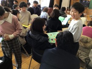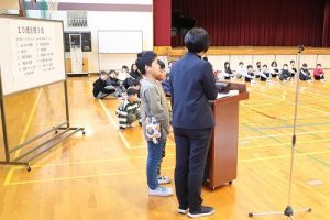 1月22日(木)5・6時間目に,4年生が「10歳を祝う会」を行いました。5時間目はクラス別に特別教室で一人一人「夢宣言」を行い,全員が発表した後に児童が保護者の席まで行ってメッセージカードを渡しました。6時間目は4年生と保護者が体育館に集まり,「認定証書授与」,続いて「学年合唱」,最後に保護者代表の方からお話がありました。大変素敵な会であったと同時に,4年生がとても「たくましく」感じました。10歳の節目において,4年生が心身ともに大きく成長したことを感じさせる会でした。