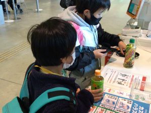 作品を見終わった後は、メディアコスモス内にあるコンビニエンスストアで買い物体験をしました。自分の財布からお金を出して、ドリンクを買うことができました。「かんがえるスタジオ」でみんなで「かんぱい!」おいしくドリンクを飲みました。