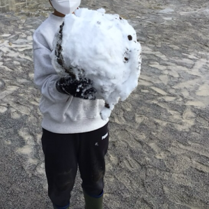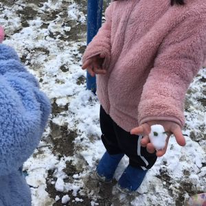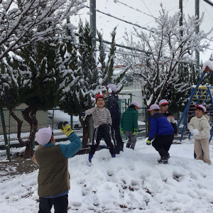 珍しく雪が降り積もった日。元気に校庭に出掛け、雪遊びをしました。積もっている雪に目を輝かせ、雪の結晶を見て楽しんだり、協力して大きな雪だるまを作ったりする様子が見られました。休み時間には、すっかり溶けてしまい、残念がる様子も見られました。
