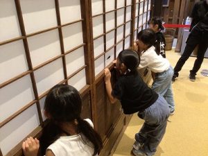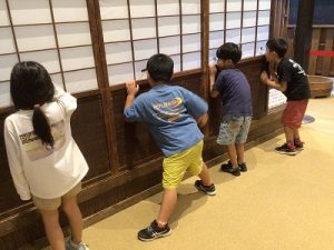 子どもたちも、たぬきと同じように破れ障子の穴から中をのぞき、