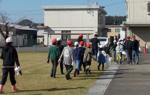わんぱく班(縦割りグループ)ごとに運動場に並び、畑に向かって出発しました。