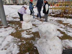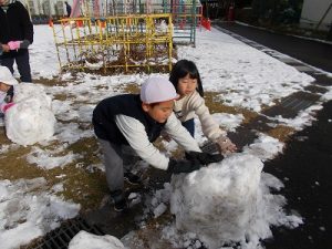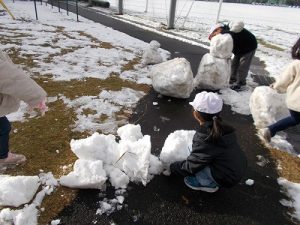 雪が溶けてしまう前に、1年生が雪遊び。