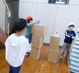 「さんぽ」の曲を合図にして、次の遊びコーナーへと移りながら楽しんでいました。