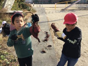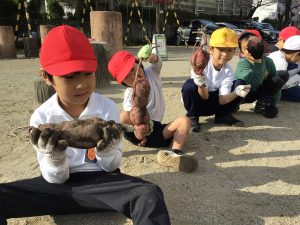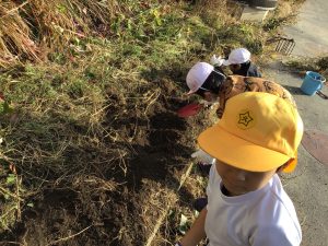 5月に植えたさつまいもを収穫しました。土の中にあるさつまいもを必死に探す姿がありました。「あったー!」「大きいおいも!」と嬉しそうに、元気な声で教えてくれました。たくさん見つけた子は隣の子に「ここにあるよ」と教えてあげたり、掘ったさつまいもを渡したりするなど優しい一面も見ることができました。さつまいもは、お家でおいしく食べてくださいね。