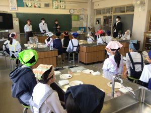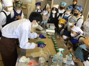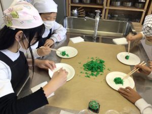 総合的な学習の時間に長森校区を主題にして探求の学びを進めている5年生は、緑水庵の和菓子職人さんをお招きして日本の伝統のよさについてお話をお聞きし,和菓子づくりを実際に体験しました。