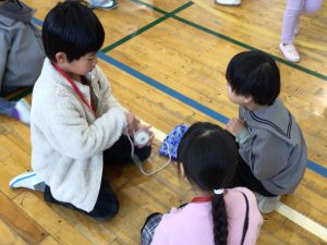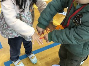 いつもは、一番年下の一年生ですが、この日はやさしいお兄さんとお姉さんとなって、けん玉やお手玉、コマ回しなどの遊び方を教えてあげることができました。