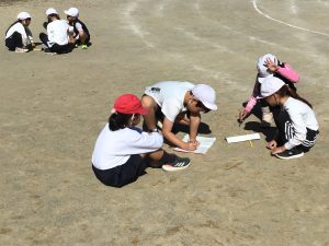 理科「太陽とかげ」では、方位磁針や棒温度計を使いながら、班で協力しながら観察や記録ができています。
