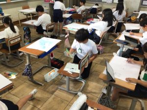 図画工作「あの日あの時の気持ち」では、絵の具を使って構図や彩色に工夫を加えた作品づくりをしています。