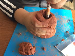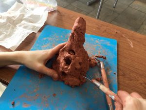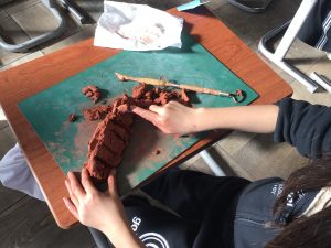 図工『けずって 見つけた いい形』の学習では、 彫塑粘土を用具で削ったり、掘ったりして作品をつくりました。また形を変えながら、自分が「面白いな」「美しいな」と感じる形を一人ひとりが作り上げ、学級の仲間と交流し、楽しく活動することができました。