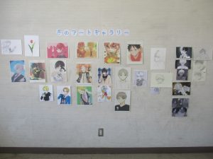 南舎3階の美術室前に「アートギャラリー」があります。現在は授業で作成した作品や美術同好会で作成した絵が展示されています。三者懇談等で本校へお越しの際は、ぜひお立ち寄りください。心がホッと和みます。