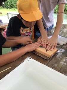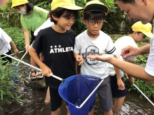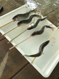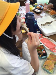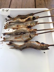 その後、自分でつかまえた鮎に自分たちで串を通しました。生き物が食べ物に変わる瞬間です。命をいただいていること、食べ物や食べ物の恵みに感謝することを実感しました。