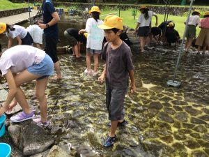 次に、鮎のつかみ取りに挑戦。浅い池でも、鮎の泳ぐスピードが速く捕まえるのは大変でしたが、みんな何とかつかんでいました。