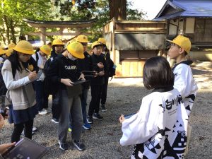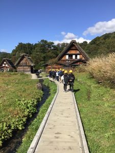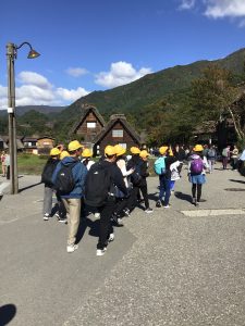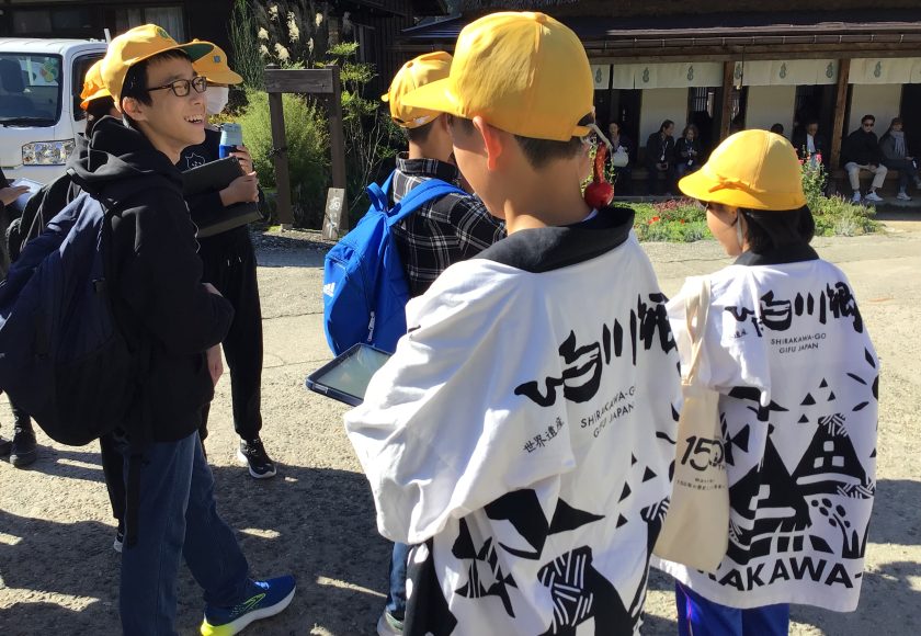到着後、白川郷クイズや長良のまちの紹介を行い合った後、白川郷学園の児童の先導・案内で白川郷の合掌造り集落を徒歩で散策しました。