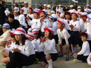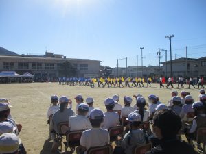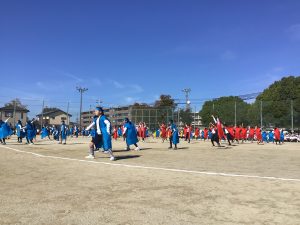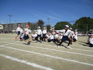 4年生は、ソーラン節。前日の練習も見ましたが、本番ではそれ以上に声が出て、気合の入った演技でした。4年生の演技に合わせて観覧席にいる5年生や6年生が身体を動かしたり手拍子をしたりする姿に、4年生でのソーラン節が本校の伝統になっていることを実感します。