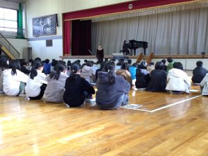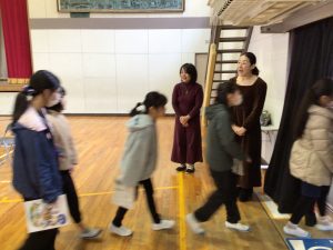 1月29日、5年生と6年生を対象に、岐阜市のアートライブウェルカムアーティストとして声楽家の山田かおり先生、中部学院大学教授の岡田泰子先生がご来校くださりました。