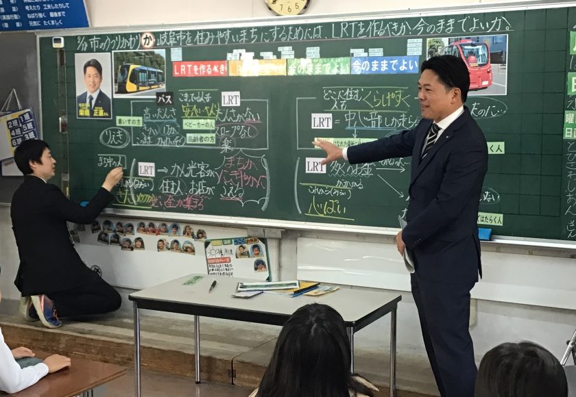 市長さんからは、LRT構想への賛否そのものではなく、社会科の学びである様々な立場に立って(=立場を想像して)物事を考えることの大切さを教えていただきました。