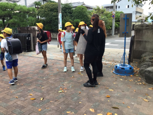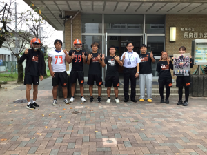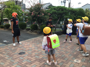 25日(木)の朝、岐阜大学のアメフト部の皆さんがあいさつ運動に来てくれました。プロテクターやヘルメットを着けたお兄さんたちとあいさつをしたり、キャッチボールをしたりしました。