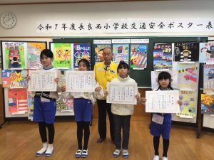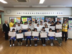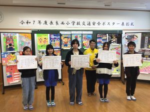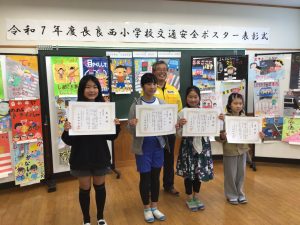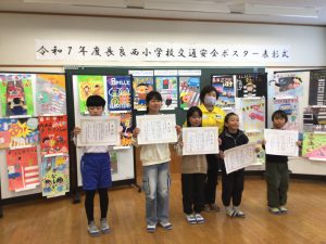 各賞を受賞した西っ子のみなさん、おめでとうございます。今回、夏休みの宝物として、交通安全ポスターに取り組んだ西っ子は約50名いました。このポスターは、岐阜北警察署、長良西公民館に展示後、地域に掲示されます。自分の「好き」や「得意」が、地域の交通安全につながっていきます。