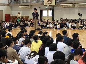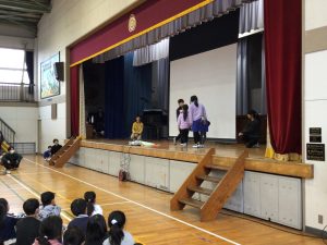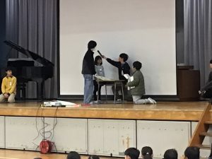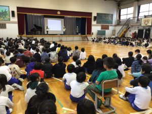 「こころがあたたかくなるとは?」図書館や配膳室、ろうかで出会った人に対して、どうすればよいのか、具体的な場面から考えました。「お願いします。ありがとう。などのあいさつをする。」や「相手の目を見て、にこっとする。」など、これまでの経験をもとに様々な意見が出ました。もうすぐ冬休みです。この集会で学んだことを、学校、家、地域で実践できるとよいです。