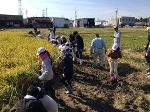 さあ、収穫です。子どもたちはやる気いっぱいです。鎌の使い方を教えていただき、安全に気を付けながら次々と稲を刈っていきました。稲刈りの楽しさ、収穫の喜びを実感した子が多くいました。ご協力いただきました地域のみなさま、ありがとうございました。