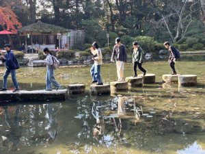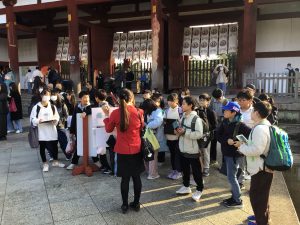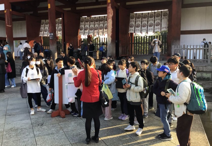 奈良公園での班別研修では、二月堂や三月堂、春日大社などを見学しました。鹿の数の多さに驚きつつも、お目当ての鹿を見つけてせんべいをあげました。鹿せんべいをもらおうと鹿がお辞儀をする様子がかわいかったそうです。
