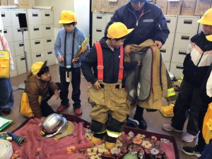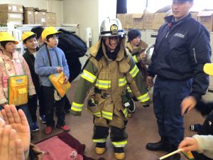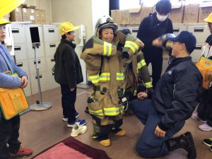 実際に防護服を着させてもらい「こんな重いものを着て働いているんだ。」と消防士のすごさを感じました。