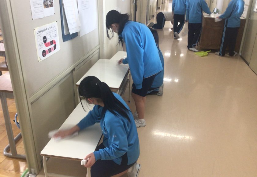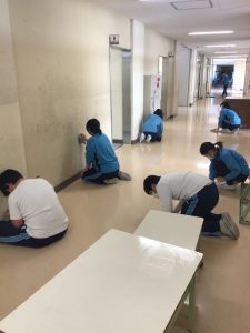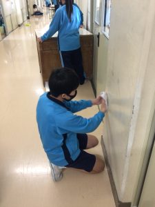 3年間過ごした校舎に感謝の気持ちを込めるとともに,1・2年生が気持ちよく生活できる美しい境川中学校にして卒業式を迎えるため,『3年生 立つ鳥活動』を行いました。廊下や壁,給食の配膳台を力一杯磨く姿,いつもの掃除ではやりきれないようなところまで丁寧に掃除しました。40分間黙々と取り組む姿に、卒業生としての誇りを感じました。