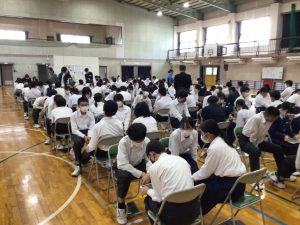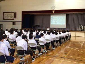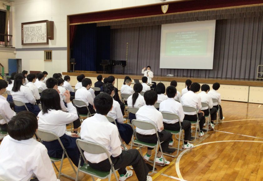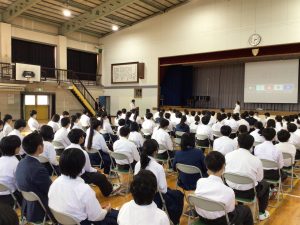 「がんは生活習慣が関係していること」「早期に発見することができれば治療が可能になってきていること」「がんの種類によっては予防するためのワクチンが開発されていること」など、生徒の疑問に答える形で講話が進みました。